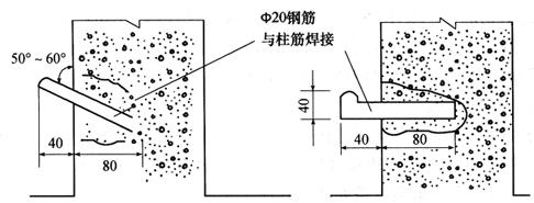 图10-50 水准网的布设 2)在整个水准网里,应有4个埋设深度足够的水准基点作为高程起算点,其余的可埋设一般地下水准点或墙上水准点。施测时可选择一些稳定性较好的沉降点,作为水准线路基点与水准网统一监测和平差。因为施测时不可能将所有的沉降点均纳入水准线路内,大部分沉降点只能采用安置一次仪器直接测定,因为转站会影响成果精度,所以,选择一些沉降点作为水准基点极为重要。 3)水准基点应根据建筑场区的现场情况,设置在较明显而且通视良好、安全的地方,且要求便于进行联测。 4)水准基点应布设在拟监测的建筑物之间,距离一般为20~40m,一般工业与民用建筑物应不小于15m,较大型并略有振动的工业建筑物应不小于25m,高层建筑物应不小于30m。总之,应埋设在建筑物变形影响范围之外、不受施工影响的地方。 5)监测单独建筑物时,至少布设3个水准基点,对建筑面积大于5000m2或高层建筑,则应适当增加水准基点的个数。 6)一般水准基点应埋设在冻土线以下0.5m处,设在墙上的水准基点应埋在永久性建筑物上,且离开地面高度约为0.5m。 7)水准基点的标志构造,必须根据埋设地区的地质条件、气候情况及工程的重要程度进行设计。对于一般建筑物及深基坑沉降监测,可参照水准测量规范中二、三等水准的规定进行标志设计与埋设;对于高精度的变形监测,需设计和选择专门的水准基点标志。 2.沉降监测点的布设 沉降监测点是设立在变形体上、能反映其变形特征的点。沉降监测布设的监测点的位置及数量,应根据建(构)筑物荷载大小、基础形式、结构特征及地质条件以及支护结构形式、基坑周边环境等因素确定。一般可根据下列几方面布设: 1)监测点应布置在深基坑及建筑物本身沉降变化较显着的地方,并要考虑到在施工期间和竣工后能顺利进行监测的地方。 2)深基坑支护结构的沉降监测点应埋设在锁口梁上,一般间距10~15m埋设一点,在支护结构的阳角处和原有建筑物离基坑很近处应加密设置监测点。 3)在建筑物四周角点、中点及内部承重墙(柱)上均需埋设监测点,并应沿房屋周长每间隔10~12m设置一个监测点,但工业厂房的每根柱子均应埋设监测点。 4)由于相邻建筑及深基坑与周边环境之间相互影响的关系,在高层和低层建筑物、新老建筑物连接处,以及在相接处的两边都应布设监测点。 5)在人工加固地基与天然地基交接和基础砌筑深度相差悬殊处,以及在相接处的两边都应布设监测点。 6)当基础形式不同时,需在结构变化位置埋设监测点。当地基土质不均匀,可压缩性土层的厚度变化不一或有暗浜等情况时需适当埋设监测点。 7)在振动中心基础上也要布设监测点,对烟囱等刚性整体基础,应不少于3个监测点。 8)当宽度大于15m的建筑物在设置内墙体的监测标志时,应设在承重墙上,并且要尽可能布置在建筑物的纵横轴线上,监测标志上方应有一定的空间,以保证测尺直立。 9)重型设备基础的四周及邻近堆置重物之处,有大面积堆荷的地方,也应布设监测点。 沉降监测点应埋设在稳固,不易被破坏,能长期保存的地方。其埋设点的标高位置,一般在室外地坪+0.500m较为适宜,但在布置时应根据建筑物层高、管道标高、室内走廊、平顶标高等情况来综合考虑。点的高度、朝向等要便于立尺和监测。同时还应注意所埋设的监测点要避开柱子间的横隔墙、外墙上的雨水管等,以免所埋设的监测点无法监测而影响监测资料的完整性。 设备基础、支护结构锁口梁上的监测点,可将直径20mm的铆钉或钢筋头(上部锉成半球状)埋设于混凝土中作为标志(图10-51)。墙体上或柱子上的监测点,可将直径20~22mm的钢筋按图10-52的形式设置。