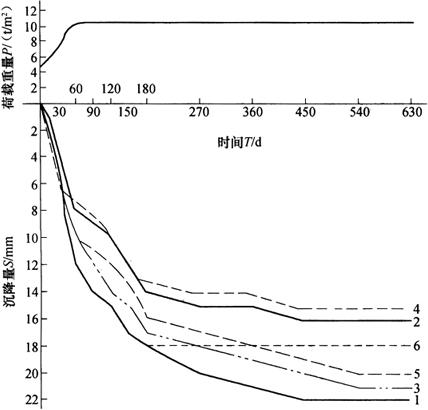 图10-52 墙体沉降监测点的埋设 在浇筑基础时,应根据沉降监测点的相应位置,埋设临时的基础监测点。若基础本身荷载很大,可能在基础施工时产生一定的沉降,即应埋设临时的垫层监测点,或基础杯口上的临时监测点,待永久监测点埋设完毕后,立即将高程引测到永久监测点上。 3.沉降监测的周期确定 沉降监测的周期应根据建(构)筑物的特征、变形速率、监测精度和工程地质条件等因素综合考虑,并根据沉降量的变化情况适当调整。施工期间的沉降监测次数不得少于4次,以得出荷载与沉降量的关系。对沉降监测时间的安排,一般可参照下面几点进行确定: 1)深基坑开挖时,锁口梁会产生较大的水平位移,沉降监测周期应较短,一般每隔1~2d监测一次;浇筑地下室底板后,可每隔3~4d监测一次,直至支护结构变形稳定为止。当出现暴雨、管涌,变形急剧增大时,要加密监测。 2)工业建筑物包括装配式钢筋混凝土结构、砖砌外墙的单层或多层的工业厂房。 ①各柱上的沉降监测点在柱子安装就位固定后进行第一次监测。 ②屋架、屋面板吊装完毕后监测一次。 ③外墙高度在10m以下者,砌到顶时监测一次;外墙高度大于10m者当砌到10m时监测一次,以后每砌5m监测一次。 ④土建工程完工时监测一次。 ⑤桥式起重机试运转前后各监测一次,桥式起重机试运转时,应按最大设计负荷监测,最好将桥式起重机满载后,在每一柱边停留一段时间,再进行监测。 3)民用建筑物及其他工业建筑物主体结构施工时,每安装完毕一层楼后,应进行一次监测,结构封顶后每两个月左右监测一次,房屋完工交付使用前再监测一次。 4)楼层荷重较大的建筑物(如仓库或多层工业厂房),应在每加一次荷重前后各监测一次。 5)水塔等构筑物应在试水前后各监测一次,必要时在试水过程中根据要求进行监测。 建(构)筑物竣工投入使用后,监测周期视沉降量大小而定,一般可每3个月左右监测一次,至沉降稳定为止。若遇停工时间过长,停工期间也要适当监测。遇特殊情况,使基础工作条件剧变时,应立即进行沉降监测工作,以便掌握沉降变化,采取必要的预防措施。 4.沉降监测的技术要求及监测方法 1)仪器和标尺要按照规范要求进行检查。水准基点要联测检查,以便保证沉降监测成果的正确性。 2)每次沉降监测工作,均需采用环形闭合方法或往返闭合方法进行检查,闭合差大小应根据不同的建筑物的监测要求确定。当用精密水准仪往返监测时,闭合差为±0.3 3)每次沉降监测应尽可能使用同一类型的仪器和标尺,人员分工为:监测1人,记录1人,立尺2人,照明2人,安全1人。 4)施工场区内各水准基点应严格按照二等水准测量规范要求进行。需连续进行监测,且全部测点需连续一次测完;并需按规定的日期、方法和既定的路线、测站进行监测。 5)在建筑施工或安装重型设备期间、仓库进货阶段进行沉降监测时,必须将监测时的施工进展、进货数量、分布情况等详细记录在附注栏内,以算出各阶段作用在地基上的压力。 5.沉降监测的成果整理 (1)整理原始监测数据记录 每次监测结束后,应检查记录中的数据和计算是否正确,精度是否合格,如果误差超限则需重新监测。然后调整闭合差,推算各监测点的高程,列入成果表中。 (2)计算沉降量 根据各监测点本次所监测高程与上次所监测高程之差,计算各监测点本次沉降量和累计沉降量,并将监测日期和荷载情况记入监测成果表。 (3)绘制沉降曲线 为了更清楚地表示沉降量、荷载、时间三者之间的关系,还需绘制各监测点的时间与沉降量关系曲线图以及时间与荷载关系曲线图,如图10-53所示。