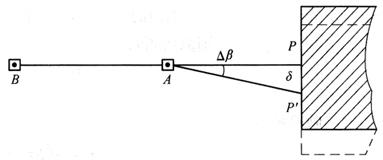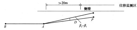 图10-54 基准线法测位移 该方法方便直观,但要求仪器架设在变形区外,并且测站与变形监测点距离不宜太远。 2.视准线小角法 用小角法测量水平位移同基准线法相类似,也是沿基坑周边建立一条轴线(即一个固定方向),通过测量固定方向与测站至变形监测点方向的小角变化△βi,并测得测站至变形位移点的距离D,从而计算出监测点的位移量△i=(△βi/ρ)D(式中,ρ=206265″)。如图10-55所示,将精密经纬仪安置于工作点A,在后视点B和变形监测点P上分别安置监测觇牌,用测回法测出∠BAP。设第一次监测值为β1,后一次为β2,计算出两次角度的变化量△β=β2-β1,即可计算出P点的水平位移量△P。其位移方向根据△βi的符号确定。