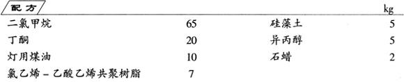 制法 按配比要求,在带夹套的反应釜中加入二氯甲烷、灯用煤油、丁酮和异丙醇,混合均匀,再往混合溶剂中加入氯乙烯-乙酸乙烯共聚树脂和石蜡,通入热水加热,树脂和石蜡溶解后停止加热,加入硅藻土,混合均匀。或于混合溶剂中添加树脂、石蜡和硅藻土后,将其总体加热,使树脂和石蜡溶解后,混合均匀,即得成品。 |