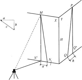 | 释义 | 建筑物的倾斜观测 基础不均匀的沉降是建筑物倾斜所引起的,对于高大建筑物影响更大,严重的不均匀沉降会使建筑物产生裂缝甚至倒塌。因此,必须及时观测、处理,以保证建筑物的安全。 对需要进行倾斜观测的一般建筑物,要在几个侧面观测。如图10-57所示,在距离墙面大于墙高的地方选一点A,安置经纬仪,分别用正、倒镜瞄准墙顶一固定点M,向下投影取其中点N,并作标志。过一段时间,再用经纬仪瞄准同一点M,向下投影得N′点。若建筑物沿侧面方向发生倾斜,M点已移位,则N与N′点不重合,于是量得水平偏移量a。同时,在另一侧面也可测得偏移量b,以H代表建筑物的高度,则建筑物的倾斜度i为: