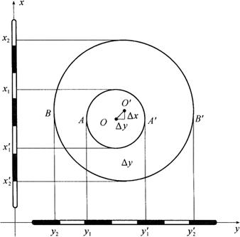 图10-58 圆形建筑物的倾斜观测 在烟囱底部边沿平放一根标尺,在标尺的垂直平分线方向上安置经纬仪,使经纬仪距烟囱的距离不小于烟囱高度的1.5倍。用望远镜瞄准顶部边缘两点A、A′及底部边缘两点B、B′,并分别投点到标尺上,得读数y1、