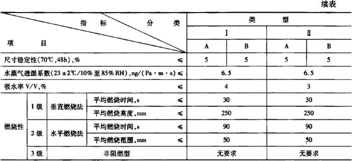 | 释义 | 建筑物隔热用硬质聚氨酯泡沫塑料 1.产品分类 (1)分类 按用途分为两种类型。 1)类型Ⅰ:适于承受轻负载,如建筑物屋顶、地板下隔层及类似的用途。 2)类型Ⅱ:适于承受重负载,如衬填材料,冷冻室地板等。 (2)分级 1)按导热系数值不同分为A、B两级。 2)根据使用要求,燃烧性能分为三级。 2.技术要求 1)板材长度,宽度应符合表9-32规定。 表9-32 硬质聚氨酯泡沫塑料的长度mm