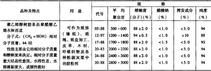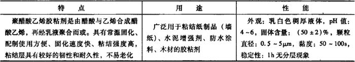 3.聚醋酸乙烯胶粘剂 聚醋酸乙烯胶粘剂是以醋酸乙烯为主要原料,经乳液聚合而制得的一种芳香白色乳状胶液。其特点是:配制使用均很方便,粘结强度较高;在常温下可以固化、固化速度快、成膜性好、耐气候、耐霉菌性良好;不含有机溶剂,无刺激性臭味;其粘结层具有较好的韧性和耐久性,不易老化。 聚醋酸乙烯胶粘剂的特点、用途和规格,如表19-11所示。 表19-11 聚醋酸乙烯胶粘剂的特点、用途和规格