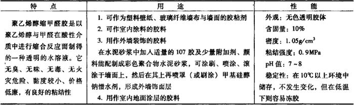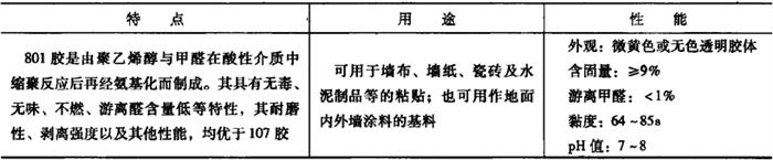 4.801胶粘剂 801胶是以聚乙烯醇与甲醛在酸性介质中缩聚反应后再经氨基化而制成。其具有无毒、无味、不燃、游离醛含量低等特性,施工中无刺激性气味等特征,其耐磨性、剥离强度以及其他性能,均优于传统的107胶。这种胶粘剂要求使用温度必须在10℃以上,其储存期一般为6个月。 801胶的特点、用途和性能,如表19-12所示。 表19-12 801胶的特点、用途和性能