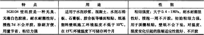 5.SG8104壁纸胶 SG8104壁纸胶粘剂是一种壁纸专用胶粘剂,其为一种无臭、无毒白色的胶液。这种胶耐水耐潮性好,浸泡7d不会开胶,并具有涂刷方便、用量节省、粘结力强等特点。尤其是初期粘结力强,用于顶棚粘贴,壁纸不会下坠,对温度、湿度变化引起的胀缩适应性能好、不开胶。施工环境温度不低于10℃,在15℃环境温度下可储存两个月。 SG8104壁纸胶粘剂的特点、用途和性能,如表19-13所示。 表19-13 SG8104壁纸胶粘剂的特点、用途和性能
