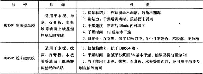6.粉末壁纸胶 粉末壁纸胶也是一种壁纸专用胶粘剂,这类胶粘结力好,干燥速度快。壁纸在刚粘贴后不剥落,边角不翘起,常温下一天基本干燥,干燥后粘结牢固。剥离试验时,胶接面粘结良好,室内湿度在85%以下时,经过三个月不翘边、不脱落、不鼓泡。 粉末壁纸胶适用于水泥、抹灰、石膏板、木板墙等墙面上粘贴塑料壁纸。粉末壁纸胶分为BJ8504粉末壁纸胶和BJ8505粉末壁纸胶两种,两者的性能虽然有所区别,但其用途基本相同。 粉末壁纸胶的品种、用途和性能,如表19-14所示。 表19-14 粉末壁纸胶的品种、用途和性能