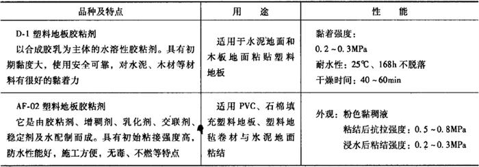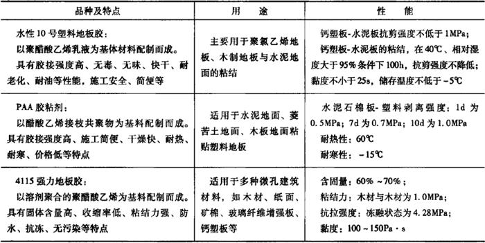 (二)塑料地板胶 塑料地板所用的胶粘剂,可供选择的品种有:聚醋酸乙烯类胶粘剂、合成橡胶胶粘剂、聚氨酯类胶粘剂、环氧树脂类胶粘剂和其他塑料地板胶粘剂。 1.聚醋酸乙烯类胶粘剂 聚醋酸乙烯类胶粘剂是以醋酸乙烯共聚物乳液为基料配制而成的塑料地板胶粘剂。这类胶的主要特点是:粘结强度高、无毒、无味、快干、耐老化、耐油等,而且兼有价格便宜、施工安全、存放稳定等优点。 在建筑装饰工程中常用的品种有:水性10号塑料地板胶、PAA地板胶粘剂、4115强力地板胶等。 (1)水性10号塑料地板胶 这种胶的最突出的技术性能是:钙塑板与水泥之间的抗剪强度不小于1.0MPa,在40℃温度、相对湿度95%的条件下,经过100h抗剪强度不降低。 (2)PAA地板胶粘剂 这种胶的最突出的技术性能是:水泥石棉板与塑料剥离强度1d可达0.5MPa,7d可达0.7MPa,10d可达1.0MPa;耐热性高达60℃;耐寒性可达-15℃。 (3)4115强力地板胶 这种胶的最突出的技术性能是:具有抗冻、耐水、无污染、收缩小等优点。被称为高级建筑胶、快速装饰胶、加强地板胶。 这类胶主要适用于聚氯乙烯塑料地板、木制地板与水泥面的胶接,其中PAA胶粘剂还用于水泥地面、菱苦土地面、木板地面粘贴塑料地板。以上几种地板胶的特点、用途和性能,如表19-15所示。 表19-15 聚醋酸乙烯类胶粘剂的特点、用途和性能
