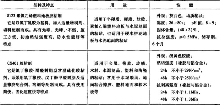 2.合成橡胶地板胶粘剂 合成橡胶类地板胶粘剂是以氯丁橡胶为基料,加入其他树脂、增稠剂、填料等配制而成。 (1)合成橡胶地板胶的特点 这类地板胶粘剂的主要特点是: 1)主体材料本身富有高弹性和柔韧性,因此赋予胶层以优良曲挠性、抗震性和抗蠕变性,可适应动态条件下的粘合,也适宜不同膨胀系数材料之间的粘合。 2)氯橡胶的分子结构比较规整,容易结晶,排列紧密,分子链上又有较大的氯原子存在,因此在不硫化的情况下,也具有较高的内聚力。 3)合成橡胶类地板胶的最明显特点是:固化速度快,初期粘合力较高,粘合后内聚力会得到迅速提高。 4)由于氯橡胶的极性比较强,因此对于大多数材料都具有良好的粘合力,适用范围比较广泛。 5)氯橡胶分子链上的氯原子对双键起着保护作用,使其活性大大降低,因而具有较好的耐热性、耐油性、耐燃性、耐候性和耐溶剂性。 6)为了进一步改善氯丁胶的粘附性和耐热性,可加入一些合成树脂对其进行改性,如我国生产的CX40胶、XY401胶等。 7)氯丁胶的最大缺点是低温性能不良,施工使用温度要求在10℃以上,储存稳定性不好,储存有效期比较短。 (2)合成橡胶类地板胶的应用 合成橡胶类地板胶的品种很多,如CX404、XY409、LDN1-5、长城牌202、1号塑料地板胶、CX40、XY401和8123聚氯乙烯塑料地板胶等。这类地板胶适用于半硬质、硬质、软质聚氯乙烯塑料地板与水泥地面的粘结,也适用于硬木拼花地板与水泥地面的粘结,还可用于金属橡胶、玻璃、木板、皮革、水泥制品、塑料和陶瓷等的粘合。 在建筑装饰工程地板铺贴中常用的XY401和8123聚氯乙烯塑料地板胶,其特点、用途和性能如表19-16所示。 表19-16 合成橡胶类地板胶粘剂的特点、用途和性能