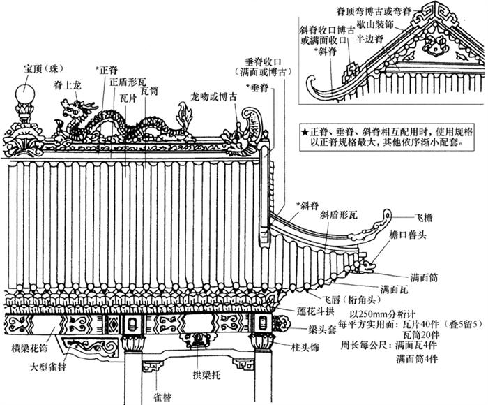 图16-5 采用琉璃制品装饰的屋面示意图 由于琉璃制品制作比较困难,价格比较昂贵,且自重较大,所以主要用于具有民族色彩的宫殿式建筑,以及少数纪念性建筑物上。此外,还常用于建造园林中的亭、台、楼、阁,以增加园林的景色。 目前,有用琉璃檐点缀建筑物立面的,这是现代新兴的一种建筑装饰设计。琉璃檐是将琉璃瓦挂贴在预制的混凝土槽形板上,然后整体安装,既美观大方,又幽雅别致,在我国北京、西安、成都、苏州等地应用较多。 建筑装饰琉璃制品具有质地致密、表面光滑、色泽鲜艳、不易玷污、经久耐用、流光溢彩、造型古朴、富丽典雅、新颖独特、融建筑与装饰为一体、富有浓厚的民族特色等优点,是仿古建筑和现代建筑理想的建筑装饰材料。 |