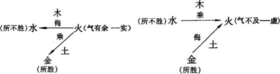 2.相克顺序之异常状态 《素问·五运行大论篇》中说:“气有余(实),则制己所胜(乘)而侮所不胜(侮);其不及(虚),则己所不胜者,侮之乘之(乘),己所胜者,轻而侮之(侮)”。意即五行中任何一行,当其出现气有余的实性异常时,就会克制(乘)自己所胜的对立行,同时反克(侮)自己所不胜的另一行;当其出现气不及的虚性异常时,自己所不胜的对立行会乘克(乘)它,自己所胜的另一对立行也会反克(侮)它。见图1-4。