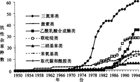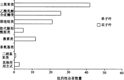 图6-2 对主要除草剂类别产生抗药性的杂草数量