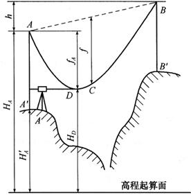 图15-10 中点天顶距观测法放样弛度 因此只需定出档距的中垂线,选定测站,测出测站点至导线中点的平距D;假定一个仪器的高程为Hm+i,以此为基准再测定两悬挂点的高程HA和HB。根据公式计算出HC和应有的天顶距Z,在竖盘上配置相应的读数;固定望远镜,照准中垂线方向进行观测,当导线落到中丝上时,即得到应放样的弛度f。 3.平视法 在导线正跨河流和山谷的观测档中,采用上述方法放样弛度不合适,此时可采用平视法。平视法的关键在于确定水准仪架设时应有的视线高HD。由图15-11可知 HD=HA-fA 式中 HA——A悬挂点的高程; fA——导线最低点D对A点的弛度。 对B悬挂点而言,它的弛度为fB;由于B点比A点高,故fB=fA+h(h为悬挂点间的高差)。于是又有 HD=HB-fB 为了求得水准仪应架设的高度HD,必须知道fA或fB。但是设计一般只给出导线中点的弛度f,因此必须根据弛度f和两悬挂点间的高差h算出导线最低点的弛度fA或fB。由式