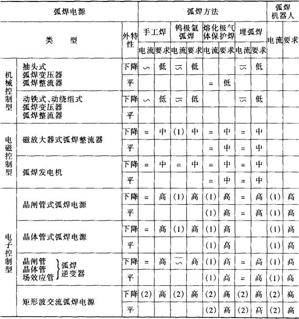 注:1.电流:“=”表示直流;“∽”表示交流;“ (1)表示直流或脉冲;(2)表示直流或交流矩形波。 2.要求:高、中、低分别为对焊接工作要求高、中、低的不同场合。 3.下降特性包括缓降特性、恒流加外拖、恒流。 |