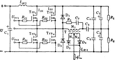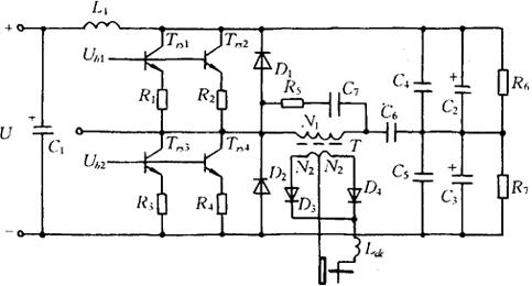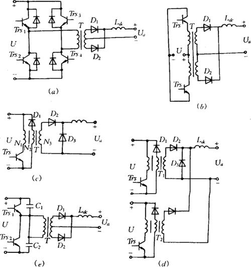 图11-16 串联半桥式晶体管弧焊逆变电源主电路 除串联半桥式之外,晶体管弧焊逆变电源主电路常用的还有四种。其原理电路如图11-17所示。