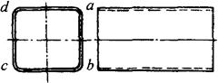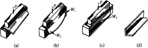图6-18 直角件的手工煨弯 2.弯制封闭的角形件 如图6-19所示的囗形工件,弯曲时首先在展开料上画线,然后以ab线定位,用规铁夹在虎钳上,并使弯曲线和规铁的棱边相重合,规铁高出垫板2~3mm,然后用手锤锤击,先弯曲ab相邻两边,见图6-20(a)、(b)。锤击时用力要均匀,并有向下压的分力,以免把弯曲线拉出而跑线。然后再弯曲cd合拢边。这时使用的规铁的形状尺寸必须和图样上的囗形工件内部尺寸相同。将规铁放在凵形工件里,底部与工件靠严,规铁上部仍要高出垫板2~3mm,夹紧后,用手锤弯曲成形,见图6-20(c)。