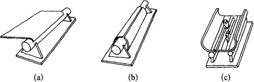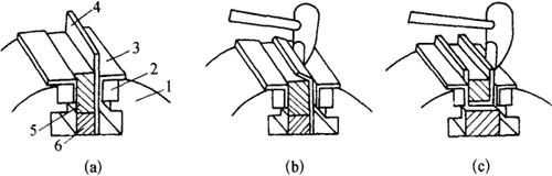 图6-20 囗形工件的弯曲 1-虎钳;2-钳口;3-垫板;4-板料;5-规铁;6垫块 3.弯制圆筒 无论是用薄板还是用厚板弯制圆筒,都应先把端头弯制好。在圆钢上打直头时,应使板边与圆钢平行放置,再锤打,见图6-21(a)。然后对于薄板可用木板或木槌逐步向内锤击,当接口重合,即施点固焊,焊后再修圆,见图6-21(b)。对于厚板可用弧锤和大锤在两根圆钢间从两端头向内锤打,基本成圆后焊接,再修圆,见图6-21(c)。