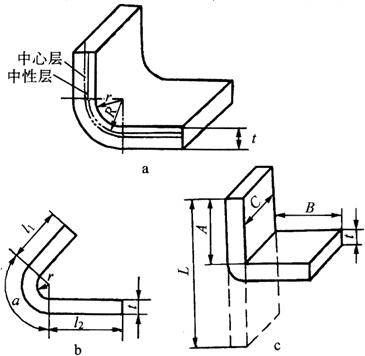 (二)折角弯板的里皮展开计算 对于没有圆角或圆角很小,即r<0.3t时的折角弯板(图6-69c),可利用等体积法,确定其展开长度,即毛坯的体积为 V=LCt 弯曲后的工件体积为