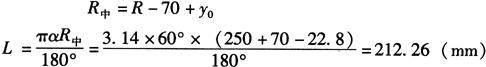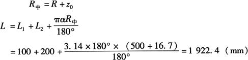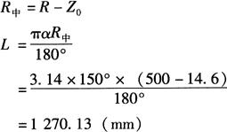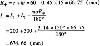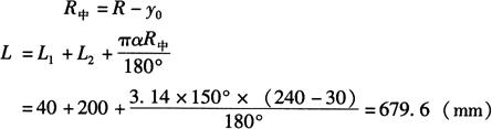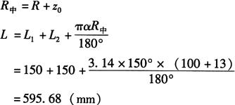 式中 L——弯曲弧长(mm); α——弯曲角度(°); R中——中性层弯曲半径(mm)。 如图6-69b所示,若已知尺寸L1=200mm,L2=300mm,r=60mm,α=150°,t=15mm,且相对弯曲半径r/t=60/15=4<5,从表6-2得k=0.45,故其中性层弯曲半径为