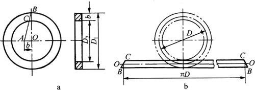 图6-71 扁钢环件的中性层展开 a.环形杆 b.腰圆环