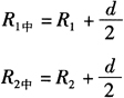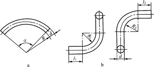 (四)型钢弯曲件中性层展开 1.圆钢弯曲件中性层展开 圆钢弯曲的中性层,一般总于中心线重合(图6-72a),所以圆钢的展开长可按中心线计算。图6-72b所示的圆钢双弯90°,已知图中L1=L2=500mm,R1=100mm,R2=150mm,d=12mm,则中性层弯曲半径为