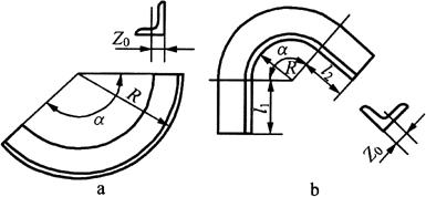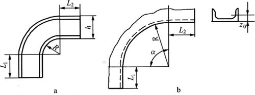 图6-75 槽钢弯曲件中性层展开 a.平弯90° b.外弯任意角 (2)立弯件中性层:槽钢立弯的展开料计算时,中性层是以重心距为准进行计算。图6-75b所示槽钢外弯工件,其两直边长度分别为L1=100mm,L2=200mm,内圆弧半径R=500mm,槽钢为14a,查得z0=16.7mm,则中性层弯曲半径为