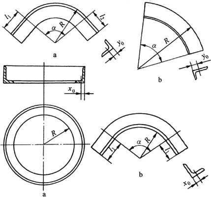 (3)不等边角钢长边内弯件的中性层:图6-74a为长边内弯不等边角钢件。两直边L1=40mm,L2=200mm,外圆弧半径R=240mm,弯曲角α=120°,不等边角钢为90mm×56mm×7mm,查得重心距γ0=30mm,则中性层弯曲半径为