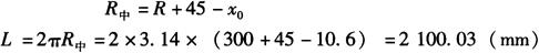 (5)不等边角钢短边内弯:图6-74c为短边内弯不等边角钢工件。已知内圆弧半径R=300mm,不等边角钢为70mm×45mm×5mm,查得重心距x0=10.6mm,则中性层弯曲半径为