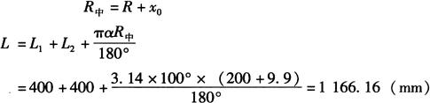 (6)不等边角钢短边外弯:图6-74d为短边外弯不等边角钢工件。两直角边L1=L2=400mm,内圆弧半径R=200mm,弯曲角α=100°,不等边角钢为63mm×40mm×6mm,查得x0=9.9mm,则中性层弯曲半径为