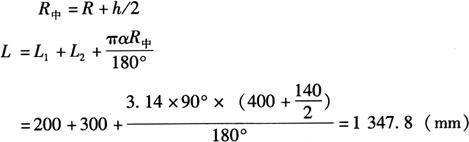 3.槽钢弯曲件中性层展开 槽钢弯曲分平弯和立弯(或称旁弯)两种形式。 (1)平弯件中性层:槽钢平弯时中性层与槽钢断面中心层重合,所以展开长应以中心层为准计算。图6-75a所示的槽钢平弯90°,两直边长度L1=200mm,L2=300mm,内圆弧半径R=400mm,槽钢规格为14a,查得h=140mm,则中性层弯曲半径为