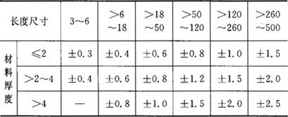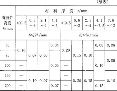 (c)将弯曲线位移一定距离 图1.2-31 防止弯曲边交接处应力集中的措施 (二)弯曲件的精度 弯曲件的精度与板料的力学性能、板料的厚度、模具结构和模具精度、工序的数量和工序的顺序、工件本身的形状尺寸等因素有关。弯曲件长度的自由公差和角度的自由公差分别见表1.2-46和表1.2-47。 表1.2-46 弯曲件长度的自由公差 (mm)
