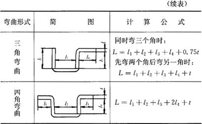 (三)弯曲件毛坯展开长度的计算 弯曲件的毛坯长度,是根据应变中性层在弯曲前后长度不变的原则来计算的。 (1)弯曲半径r<0.5t时,毛坯展开长度的计算(表1.2-48)。 表1.2-48 在r<0.5t的弯曲中,求毛坯展开长度的公式