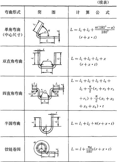 (2)弯曲半径r>0.5t时,毛坯展开长度的计算(表1.2-49)。 表1.2-49 在r>0.5t的弯曲中,求毛坯展开长度的公式