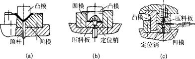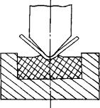 图1.2-40 利用弹性凹模进行弯曲 ⑤采用其他工艺。 (a)在允许的情况下,采用加热弯曲。 (b)对U形弯曲件,可采用较小间隙甚至负间隙(c<t)弯曲。 (c)用校正弯曲代替自由弯曲。 |