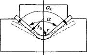图1.2-33 回弹引起的弯曲角和弯曲半径变化 回弹值包括弯曲半径回弹值△r和弯曲角回弹值△α △r=r0-r △α=α0-α 式中 r0、α0——回弹后的弯曲半径(mm)、弯曲角(°); r、α——凸模半径(mm)、凸模的弯曲角(°)。 ①相对弯曲半径r/t较小(r/t<10)的工件。由于