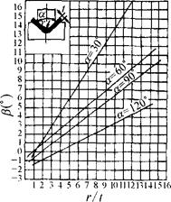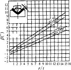 图1.2-34 08号~10号钢在弯曲时的回弹角β α=30°时,β=0.75r/t-0.39 α=60°时,β=0.58r/t-0.80 α=90°时,β=0.43r/t-0.61 α=120°时,β=0.36r/t-1.26