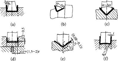 图1.2-38 压制加强筋 ②从模具设计上考虑。对一般材料,可采用补偿法,在凸模和凹模上做出回弹角的斜度,使工件回弹后恰好等于所要求的角度(图1.2-39a、b、c)。