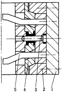 图4-114 弯销延迟分型机构 1—定模板 2—锁紧块 3—型芯 4—滑块 5—弯销