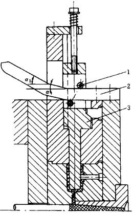 图4-115 不同斜角的弯销抽芯机构 1—滚轮 2—弯销 3—滑块