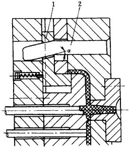 图4-116 定模弯销内侧抽芯 1—滑块 2—弯销
