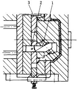 图4-117 动模弯销内侧抽芯 1—滑块 2—弯销 3—限位钉 图4-118为弯销、斜导柱分级抽芯。由于制品A处较薄,为避免制品被夹坏,采用分级抽芯。滑块2可在滑块3上滑动,滑块3可在推板5上滑动,开模时在弯销1作用下,完成滑块2的抽芯,顶出时,推板5被推动,斜导柱4拨动滑块3完成二级抽芯。