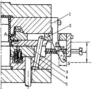 图4-118 弯销、斜导柱分级抽芯机构 1—弯销 2—滑块 3—滑块 4—斜导柱 5—推板 图4-119为弯销二级抽芯机构。由于制品内圈较薄,为防止该处拉坏,采取了二级抽芯。开模时,由于止动销8的作用,弯销6先带动外滑块5,型芯由接头3与外滑块连接,从而使型芯1抽动,消除制品对其包紧力,继续抽拔至S1距离时,止动销8已脱开内滑块4,通过限位螺钉7开始二级抽芯,此时内滑块4被带动,从而带动型芯2完成整个抽芯过程。