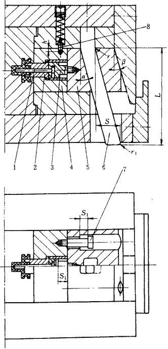 图4-119 弯销二级抽芯机构 1—型芯 2—型芯 3—接头 4—内滑块 5—外滑块 6—弯销 7—限位螺钉 8—止动销 |