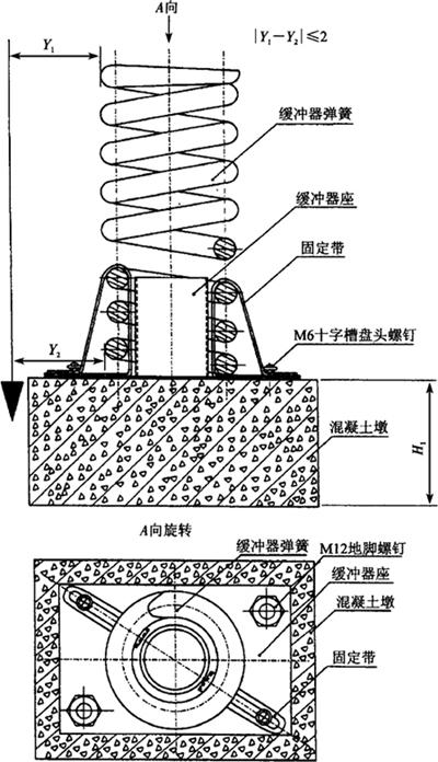 最后将缓冲器安装在底座上,并用固定带固定缓冲器弹簧(对于弹簧带底座的,直接用螺栓将弹簧缓冲器安装在底座上)。确保弹簧缓冲器的垂直度误差在2mm以内,如图10.2-2所示。