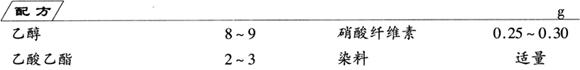 按配方要求将硝酸纤维素溶解在乙酸乙酯中,搅拌混合使其全溶后,再慢慢加入乙醇继续搅拌混匀。后加入染料,搅拌使其全溶,即为成品。