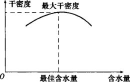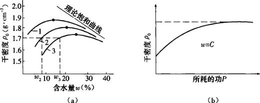 (三)压实功的影响 由压实试验可知,在同类土中施加不同的压实功,可得到若干条相应的含水量与干密度的关系曲线,如图1-65a所示。从图中可以看出:(1)当填土中含水量较小时,如果要求压实效果相同,含水量不同,所需要施加的压实功不同,即当要求压实效果相同时,干土要比湿土多消耗压实功;(2)当填土中的含水量增大至某一限度时,压实功的增加也不能改善压实效果;(3)当填土的含水量在某一适当值时,开始压实时土的干密度会急剧增加;待到接近土的最大干密度时,即使压实功增加很多,而土的干密度变化很小,如图1-65b所示。