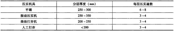 图1-65 压实功对填土压实的影响 (a)不同压实功对压实效果的影响;(b)压实功与土干密度关系曲线 1、2-压实功较大的机械夯实曲线;3-压实功较小的人工夯实曲线 由此可以看出,盲目增大压实功不仅不能增加压实效果,反而造成浪费功能、破坏土体。在实际施工中,只要选用的压实机械合适,对于砂性土只需碾压或夯实2~3遍,对于亚砂土只需3~4遍,对亚黏土或黏土只需5~6遍。另外,大面积松土不宜用重型碾压机械直接滚压,否则土层有强烈起伏现象,不仅效率不高,而且不易压实。如果先用轻型碾压实,再用重型碾压实,就会取得较好的效果。 填土的压实遍数有很多影响因素,如压实机具种类、分层的厚度、压实度的要求等,大型重要土方压实工程,必须进行碾压试验确定。不同压实机械分层填土虚铺厚度与压实遍数,可参考表1-26。 表1-26 不同压实机械分层填土虚铺厚度与压实遍数