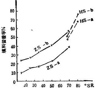 | 释义 | 影响填料留着率的因素 1.填料颗粒的形状 一般认为,填料颗粒的形状对留着率有影响,并且填料的表面粗糙度也有影响。例如石膏和高岭十都是圆形的,但是高岭上的表面较粗糙,所以留着率高于石膏。石棉是针状的,具有较好的留着率。 2.浆料的打浆度 提高浆料的打浆度可以增加填料留着率,其原因是: ①打浆度较高的浆料易于形成紧密的薄层; ②打浆度较高的浆料在网上的脱水较慢; ③打浆度较高的浆料的单位面积上纤维个数有所增加。 浆料的打浆度与纸中填料留着率的关系如图10—4—25所示。