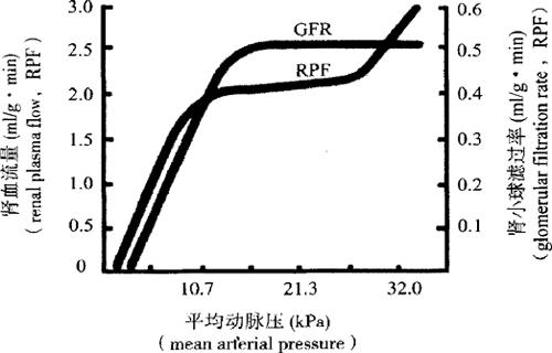 | 释义 | 影响肾小球滤过的因素 凡是影响滤过膜、滤过压和肾血浆流量的因素都会影响肾小球的滤过。 (一)滤过膜 滤过膜通过两方面影响肾小球的滤过。 1.滤过膜的通透性 滤过膜通透性的改变主要影响尿的成分。由于炎症、缺氧、中毒等情况使滤过膜的通透性增大,原来不能滤出的血浆蛋白滤出,尿中含有蛋白质,称为蛋白尿(proteinuria);甚至红细胞也滤出,成为血尿(hematuria)。 2.滤过膜的面积 当滤过膜的面积减少时,如急性肾小球肾炎(acute glomerulonephritis),由于肾小球毛细血管的管腔狭窄或完全阻塞,使滤过面积减少,进而滤过率下降,尿量减少,甚至无尿。 (二)有效滤过压 因为有效滤过压是由三个压力综合而成,所以影响到其中任何一个压力时,都会影响肾小球的滤过。 1.肾小球毛细血管血压 由于肾血流量的自身调节作用(图1l-41),平均动脉血压在10.6~23.9kPa(80~180mmHg)范围内变化时,肾血流量保持相对稳定,此时肾小球毛细血管血压也相对稳定。但是当动脉血压降至10.6kPa(80mmHg)以下时,肾小球毛细血管血压将相应下降,使有效滤过压减少,肾小球滤过率减少,尿量减少。当动脉血压降至5.3~6.7kPa(40~60mmHg)时,有效滤过压等于0,而无尿。大失血患者血压降低,引起少尿或无尿,肾小球毛细血管血压降低即是原因之一。