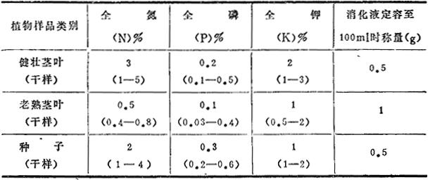 表29-1内括号内数据是多数样本含量范围。如样本为新鲜茎叶,则可按水分%估算增加重量。例如含水分为80%的新样可按干样称量增加5倍。表29-1中称量是按氮磷钾二次平行测定而设计的(定容100ml),如在生产和科研工作中只须作单次测定,或者不用四苯硼钠重量法测定钾时,则可将称量及各试剂用量都减半,以缩短消煮时间,消煮后改为定容50ml。硫酸—过氧化氢消煮法加H2O2要直接滴入瓶底液中,不可沾于瓶颈,不要滴于小漏斗上,以免遗留的H2O2影响以后测磷。 |